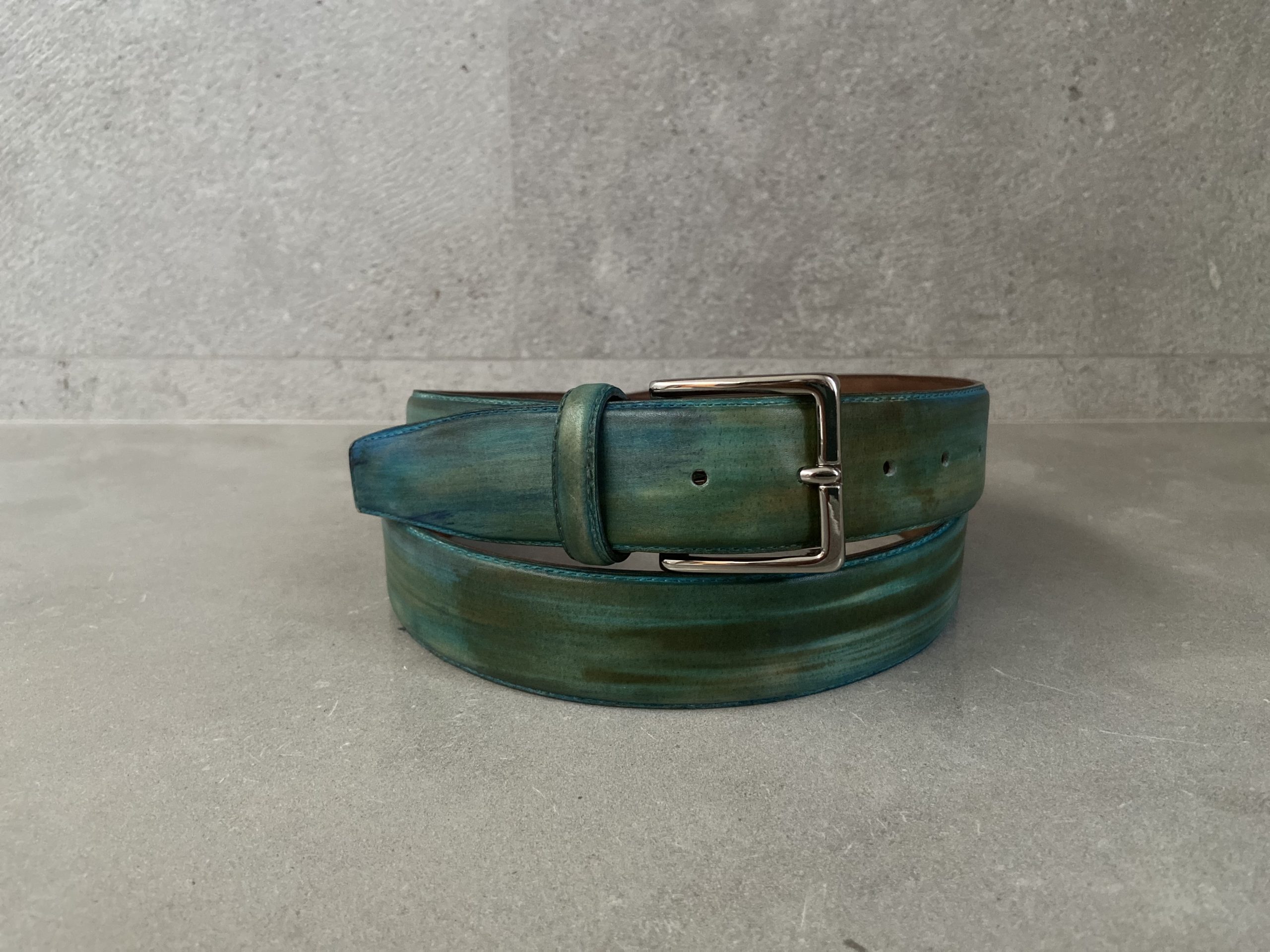Montée et patinée à la main. Doublure en veau. Boucle en laiton massif finition nickelée. Largeur 3.5 centimètres.